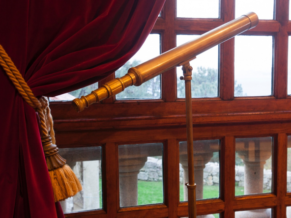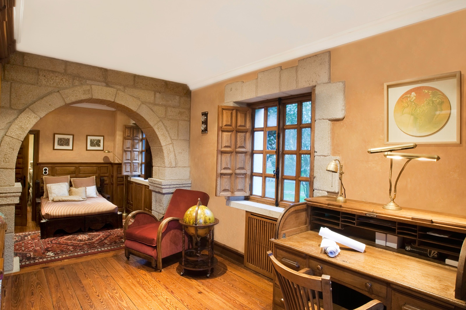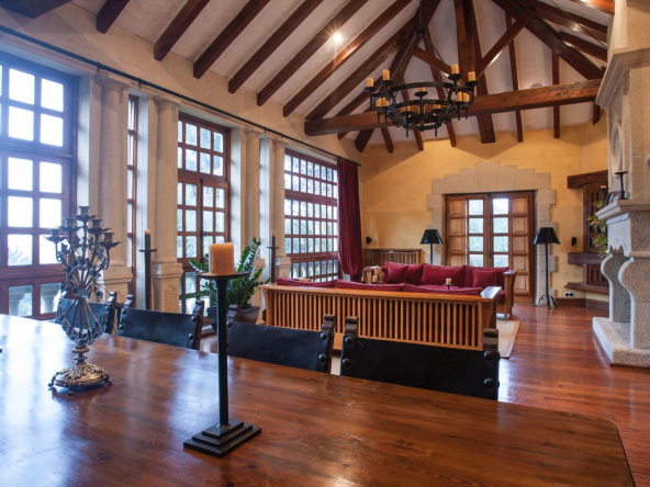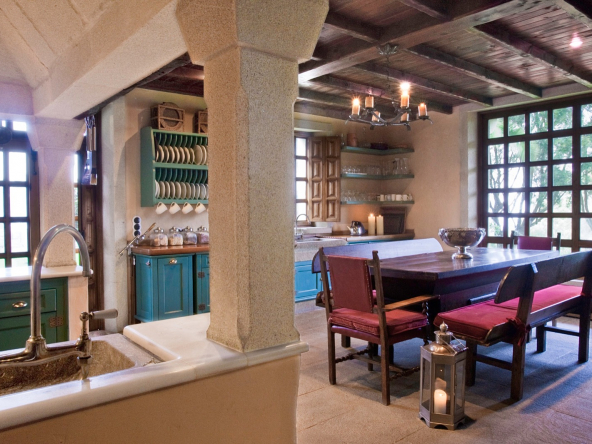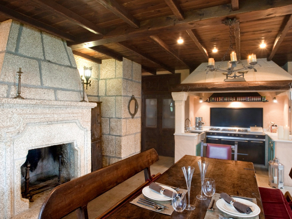 On the first floor, we find the grand dining and living room area, with 4 meter high vaulted high ceilings, a wood-burning large stone fireplace and a small balcony terrace overlooking the front garden, the Atlantic Ocean and the coastal town of Baiona.